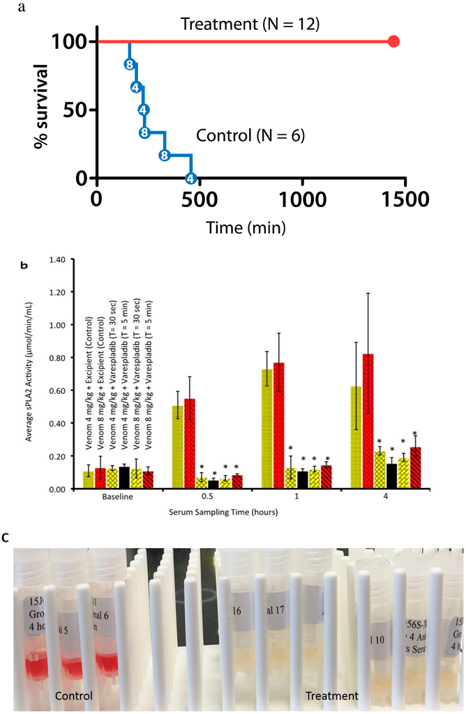 Lewin M, Samuel S, Merkel J, Bickler P. Varespladib (LY315920) Appears to Be a Potent, Broad-Spectrum, Inhibitor of Snake Venom Phospholipase A2 and a Possible Pre-Referral Treatment for Envenomation. Toxins. 2016; 8(9):248. https://doi.org/10.3390/toxins8090248