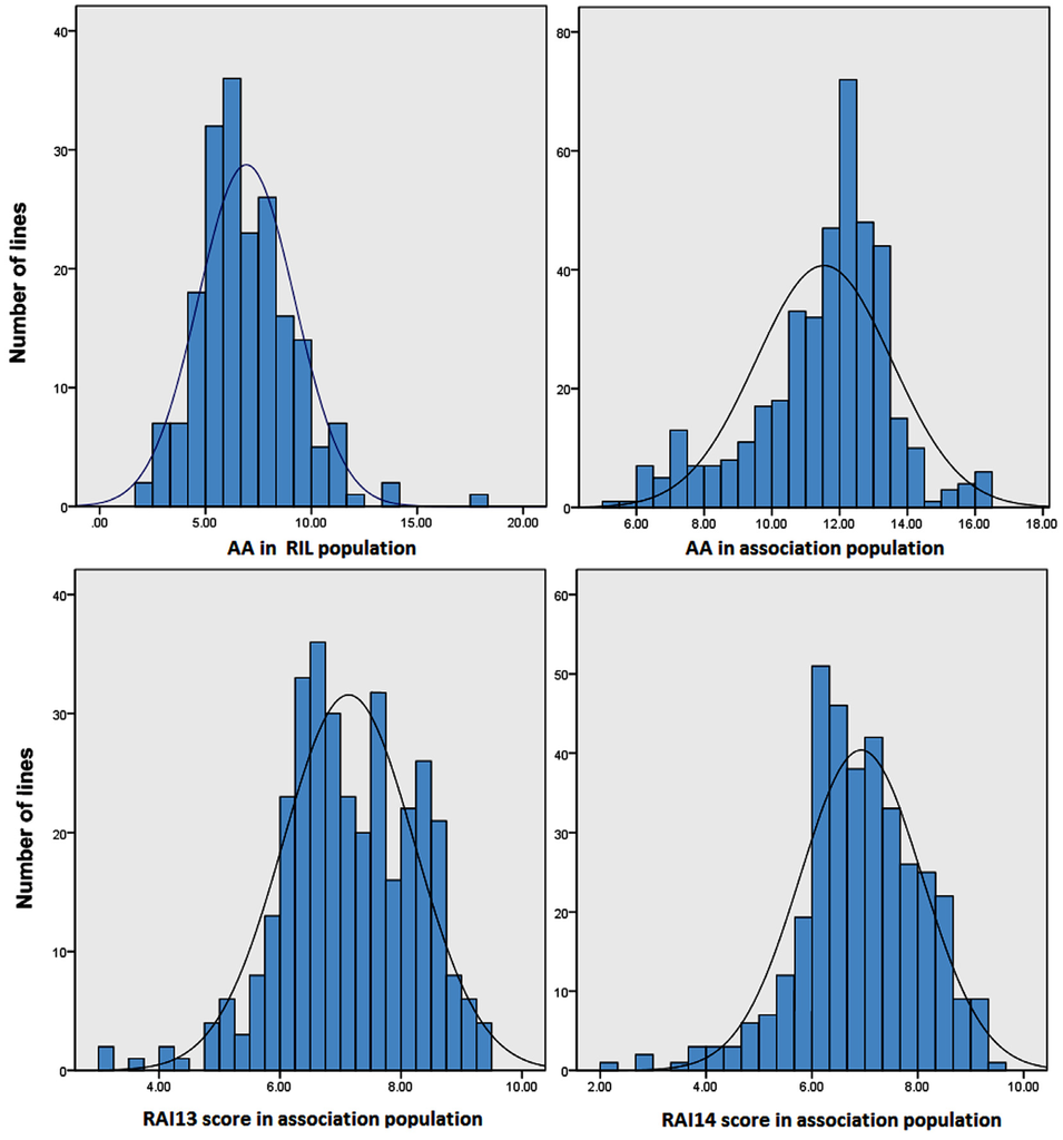 A correlation analysis was performed for the AA and RAI score (Table 2). In the RIL population, there was a significant positive correlation between the AA and RAI score. In the association population, the AA showed a significant positive correlation with the RAI score in both 2013 and 2014, and the 2013 RAI score was significantly correlated with that of 2014.