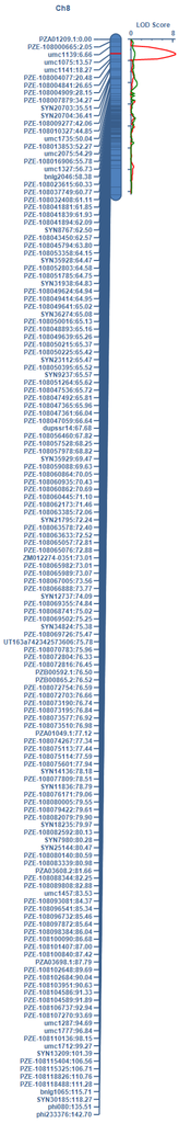 Quantitative trait loci (QTL) for the amount of aflatoxin (AA, μg/kg) on maize chromosome 8. The designation on the left is the genetic distance (centi-Morgan, cM) and marker name. The right shows the likelihood odds (LOD) scores of the QTL on the chromosome.