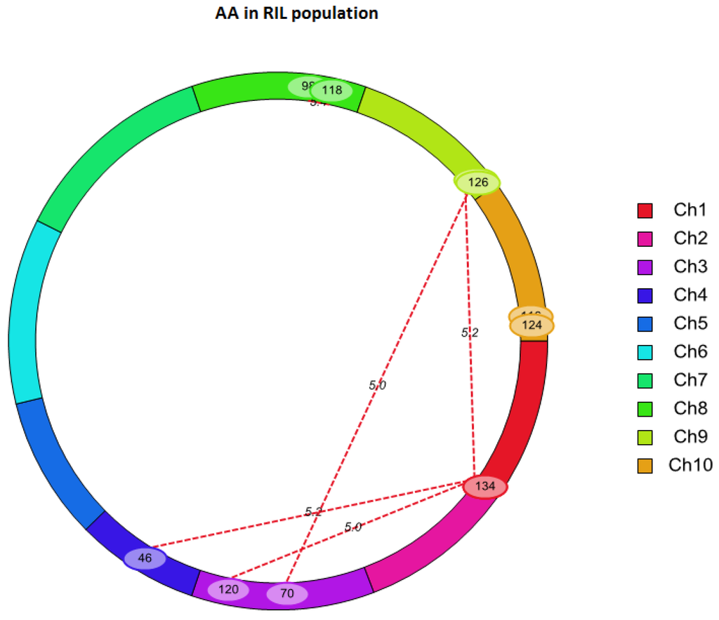 Epistatic effects on the amount of aflatoxin (AA). The lines denote epistatic associations between QTLs.