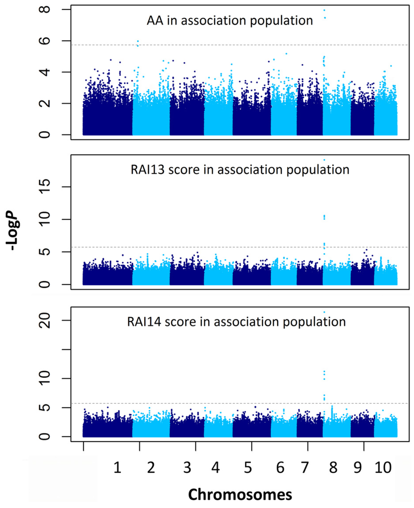 Genome-wide association mapping of the amount of aflatoxin (AA, μg/kg) and the score of resistance to A. flavus infection (RAI) based on SNPs. The dashed line indicates a significant association signal (−logP ≥ 5.74).