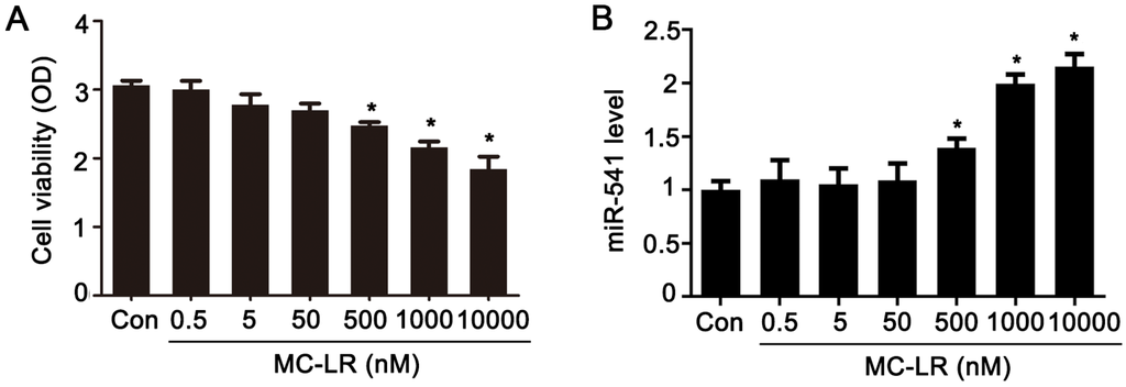 We treated GC-1 cells with various concentrations of MC-LR for 24 h. Cell viability was significantly decreased at an MC-LR concentration of 500 nM or above (Figure 1A). The expression of miR-541 was significantly upregulated after exposure to MC-LR at these concentrations (Figure 1B).