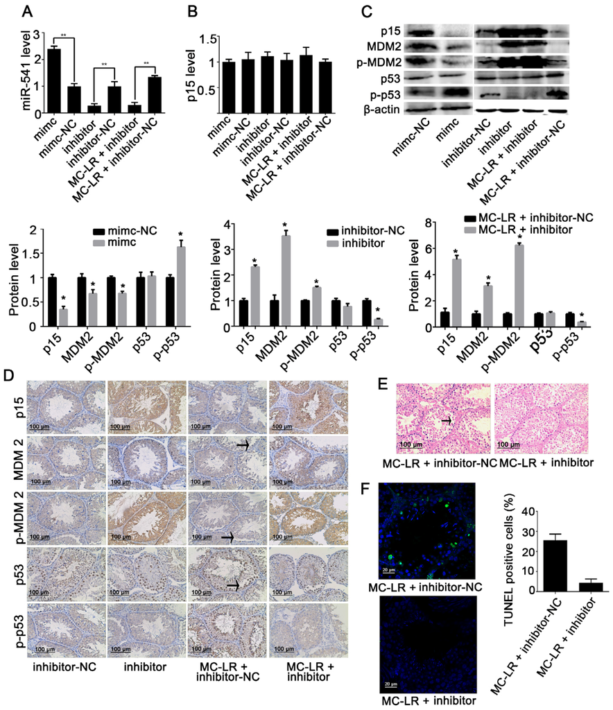 Validation of the functions of miR-541 in mouse testes. Mice received miR-541-inhibitor (inhibitor), miR-541-mimic (mimic), miR-541-inhibitor negative control (inhibitor-NC), or miR-541-mimic negative control (mimic-NC) via efferent duct injection, with or without intraperitoneal administration of 15 μg/kg body weight MC-LR. The mRNA levels of miR-541 (A) and p15 (B) were measured with qRT-PCR; (C) The protein levels of p15, murine double minute2 (MDM2), phospho-MDM2 (p-MDM2), p53, and phospho-p53 (p-p53) were measured by Western blot. The expression levels were quantified with ImageJ (lower panels; n = 3). β-actin was used as a loading control; (D) The expression of p15, MDM2, p-MDM2, p53, and p-p53 in testes was observed by immunohistochemistry. Positive cells are marked by an arrow; (E) The testicular tissue structure was determined by H&E staining. The arrow indicates the loss of spermatogenic cells; (F) Fluorescent images of testicular tissues following double staining for TUNEL (yellow) and the nuclear stain DAPI (blue) are shown. The percentages of TUNEL positive cells were quantified (right panels; n = 3). Results are expressed as means ± S.D. * p < 0.05.