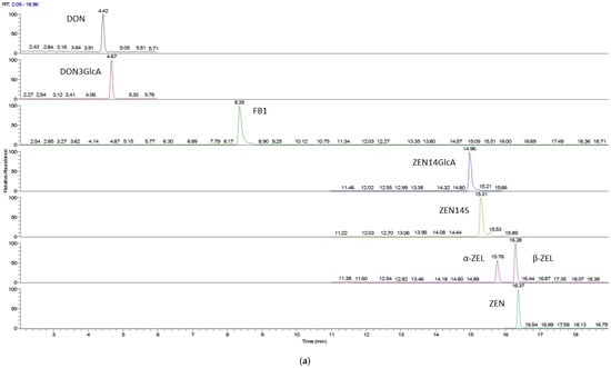 According to the previous literature, DON, DON-GlcA, and DOM-1 were monitored as biomarkers for dietary DON exposure, ZEN, α- and β-ZEL, ZEN14GlcA, and ZEN14Sulf for dietary ZEN exposure, and FB1 for dietary FB1 exposure. Unfortunately, under the applied chromatographic conditions, DON3Glc and DON15Glc coelute, and therefore the quantification was given as the sum of both peaks. As a consequence, due to the lack of proper quantification of DON15GlcA, the major human metabolite of DON [26], an underestimation of DON exposure cannot be ruled out.