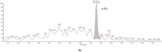 For each analyte considered, selectivity limit of detection (LOD) and limit of quantification (LOQ) were obtained using not-contaminated urine as blank. Selectivity was assessed by checking the absence of interferences for the chosen mass transitions. Moreover, the detection of the different mycotoxins was performed dividing the run in three different time segments on the basis of the analyte retention times: in the first segment the transitions of DON, DOM-1, and DON-3-GlcA were monitored, in the second those of FB1, while in the third those of ZEN and its derivatives. Values for LOD and LOQ were 0.32 and 1.07 µg/L for DON, 0.13 and 0.43 µg/L for DON-GlcA, 0.003 and 0.009 µg/L for ZEN, 0.09 and 0.30 µg/L for ZEN14GlcA, 0.03 and 0.09 µg/L for ZELs, 0.05 and 0.17 µg/L for FB1. A stock solution at the concentration of 50 µg/L of all considered analytes was prepared using a blank urine extract as solvent. Then, calibration curves were obtained by diluting the stock solutions at five different concentration levels in the range 10–200 µg/L. Recovery rate percentages (RR%) were calculated for DON, ZEN, αZEL, and βZEL and FB1 by extracting and analyzing one blank urine sample spiked with a concentration of 50 µg/L of each analyte. All the RR% values were in the range 90%–100%. Recovery was slightly lower for conjugates (DON-Glc, ZEN14Glc) in consideration of the higher polarity of these compounds (RR% > 80%). A chromatogram of standard mixture and of a urine sample containing α-ZEL is reported in Figure 1.