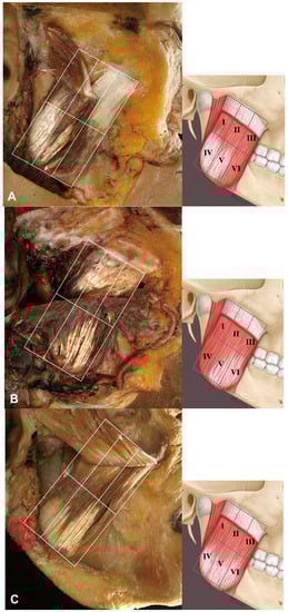- Kim, D.H.; Hong, H.S.; Won, S.Y.; Kim, H.J.; Hu, K.S.; Choi, J.H.; Kim, H.J. Intramuscular nerve distribution of the masseter muscle as a basis for botulinum toxin injection. J. Craniofac. Surg. 2010, 21, 588–591. [Google Scholar] [CrossRef] [PubMed]