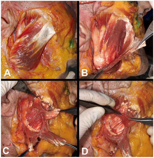 The skin of the midface was carefully removed, and the superficial musculoaponeurotic system (SMAS), parotid gland, and masseteric fascia were dissected to reveal the entire masseter. The superficial part of the masseter was dissected to expose and observe the morphological patterns and location of the deep tendon structure.