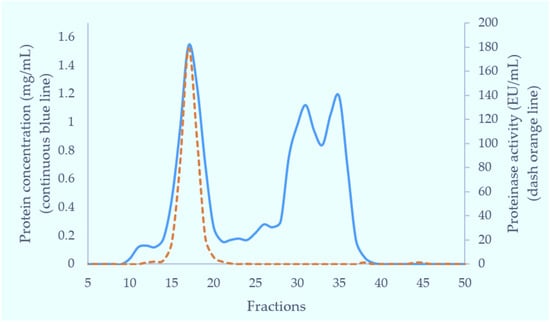 Fractionation of Myanmar Russell’s viper crude venom through Superdex 200 gel filtration column (5 × 160 cm). Crude venom was separated in 0.01 M phosphate buffered saline (pH 7.4) at 2 mL/min. Each fraction was 6 mL in volume. The blue continuous line shows the protein concentration (mg/mL) and the orange dashed line shows protease activity (EU/mL) in collection fractions.