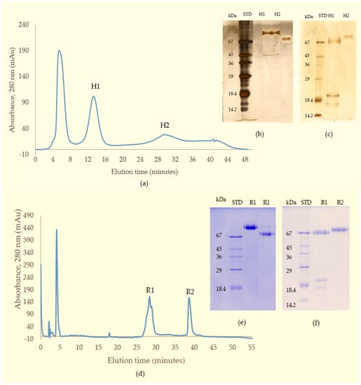 (a) Chromatography of fraction Q1 from the Resource Q column on Phenyl Superose column (HIC) showing protein-containing peaks (H1 and H2); (b) non-reducing; and (c) reducing SDS-PAGE of purified proteins (silver-stained); (d) Chromatography of fraction Q1 from Resource Q column on a C4 RP-HPLC column; Two protein peaks were observed: R1 and R2; SDS-PAGE of purified proteins R1 and R2 (e) under non-reducing conditions; and (f) reducing conditions.