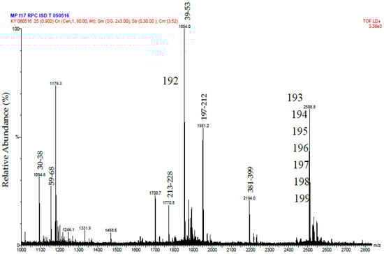 MALDI-MS spectrum of tryptic peptides from purified Daborhagin. The data was obtained by digesting the R2 fraction from RP-HPLC with trypsin. The numbers above the peptides masses indicates the residue numbers for the peptides matched to the sequence of Daborhagin K (VM3DK_DABRR) (B8K1W0). All m/z values are for the M + H+ ions. The ions at 1854 and greater have been labeled with the m/z value for the ion containing one carbon as the C13 isotope.
