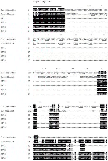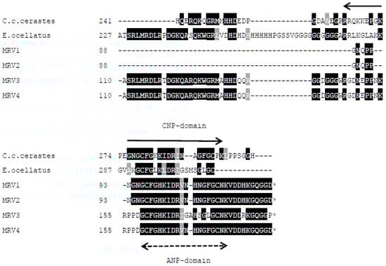 Multiple sequence alignment of the polypeptide encoded by Myanmar Russell’s viper SVMPI transcripts (MRV1-4) with those of two African vipers [C. c. cerastes (A8YPR9) and E. ocellatus (A8YPR6)]. The signal peptides are denoted by a solid line. The active tripeptides are underlined and identified with three asterisks. The varied residue is identified by a single asterisk. The CNP domains are indicated with a solid arrowed line and ANP domains with a dashed arrowed line.