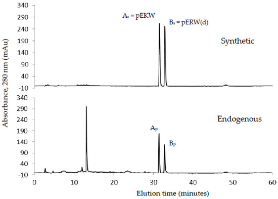 C18 RP-HPLC analysis of synthetic tripeptides, pEKW and pERW (1 μg of each) (upper panel); and fraction 48 (200 μL) (lower panel) obtained from gel filtration chromatography of crude venom. Peak As and peak Bs represent the two synthetic tripeptides. Peak Ap and peak Bp represent the two tripeptides from Fraction 48.