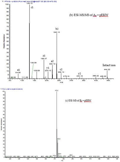 The aforementioned inhibitory tripeptides were purified from the MRV venom as their pyroglutamate forms, pEKW and pERW. These were identified using RP-HPLC (co-chromatography with synthetic peptides), LC-ESI-MS analysis of intact mass and LC-ESI-MS/MS sequencing. Although the tripeptide pEKW purified from MRV venom has been found in other snake species, such as Trimeresurus mucrosquamatus [10], Echis ocellatus, and Cerastes cerastes cerastes [14], the tripeptide pERW purified here has not been found in the venom of any other snake species.