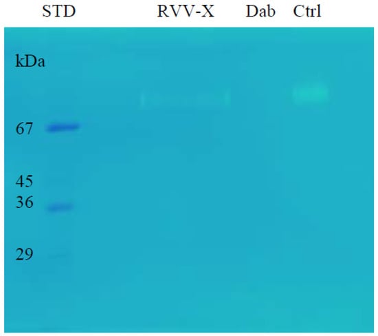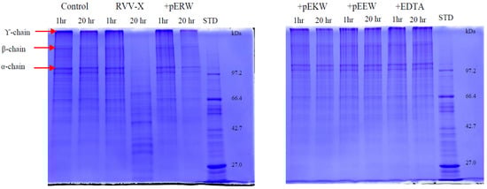 The fibrinogenolytic activity of the two proteins was determined using 12% SDS-PAGE after incubation with fibrinogen solution for different times at 37 °C. Daborhagin digested the α-chain of human fibrinogen within 1 h of incubation. RVV-X only revealed fibrinogenolytic activity after an overnight incubation (Figure 10).