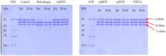 Fibrinogenolytic activity of Daborhagin. Fibrinogen (1 mg/mL) was incubated with 10 μg/mL Daborhagin for 1 h and 20 h at 37 °C with or without EDTA or synthetic tripeptides: pERW, pEKW, pEEW. Control = reduced fibrinogen, STD = molecular weight markers.