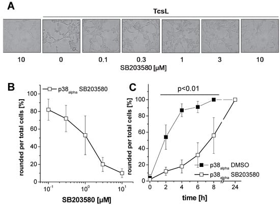 - The protective effects of SB203580 treatment and of p38alpha deletion are likely based on inhibition of endocytic uptake of TcsL rather than on inhibition of the toxins’ glucosyltransferase activity.