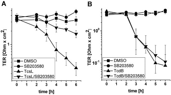 - Treatment with SB203580 protects epithelial monolayer from loss of epithelial barrier function induced by TcsL (not by TcdB).
