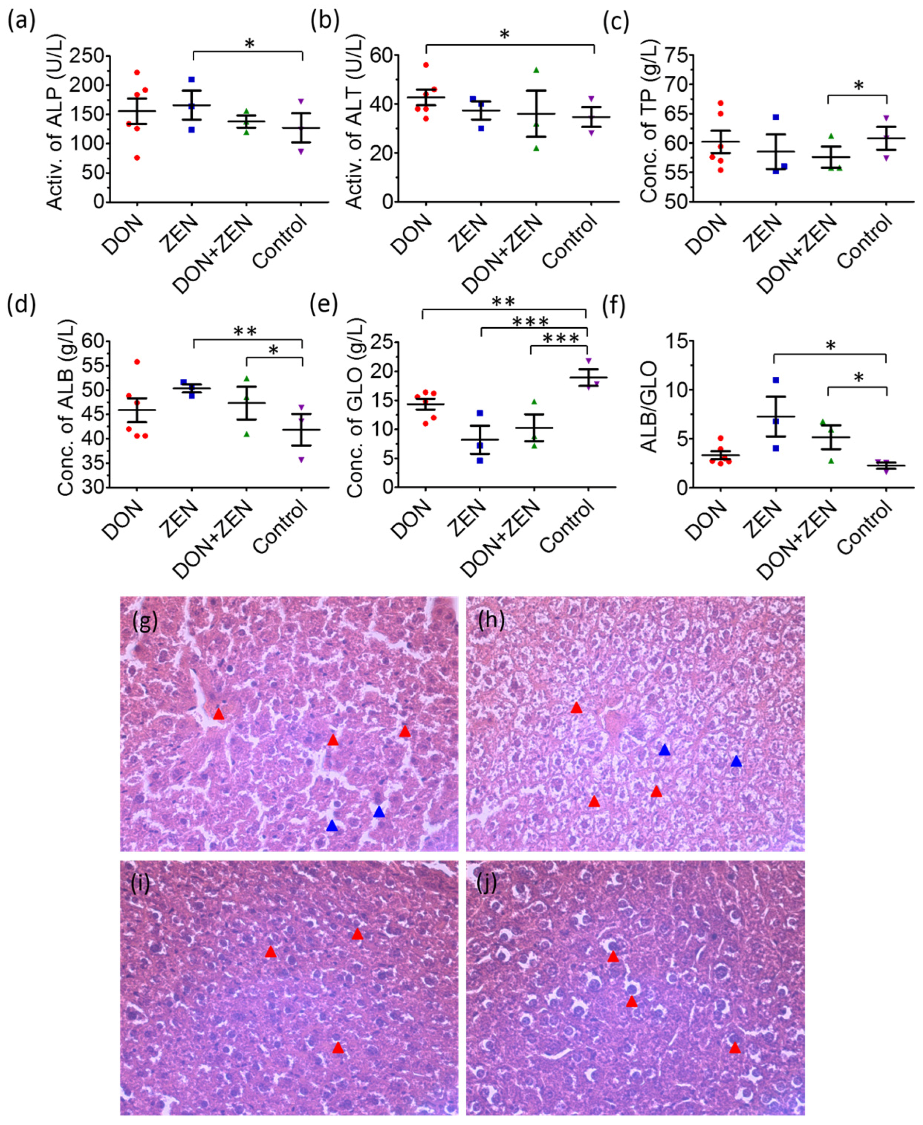 Scatter plots for serum levels of (a) Alkaline phosphatase (ALP); (b) alanine transaminase (ALT); (c) total protein (TP); (d) albumin (ALB); (e) globulin (GLO); and (f) ALB/GLO of mice treated with 2 mg/kg deoxynivalenol (DON), 20 mg/kg zearalenone (ZEN), and combined DON + ZEN with final concentration 2 mg/kg DON and 20 mg/kg ZEN, for 21 days. * for p value < 0.05; ** for p value < 0.01, and *** for p value < 0.001. Histopathological examination of control and mycotoxins-treated liver tissues by hematoxylin and eosin (HE) staining; (g) Liver of 2 mg/kg DON; and (h) liver of 20 mg/kg ZEN-treated mice for 21 days, showing epithelial cell (blue arrow) and inflammatory cell infiltration (red arrow); (i) Liver of combined DON + ZEN (final concentration 2 mg/kg DON and 20 mg/kg ZEN) treated mice for 21 days, showing slight inflammatory cell infiltration; (j) Control mice with normal livers. Magnification times: 200×.