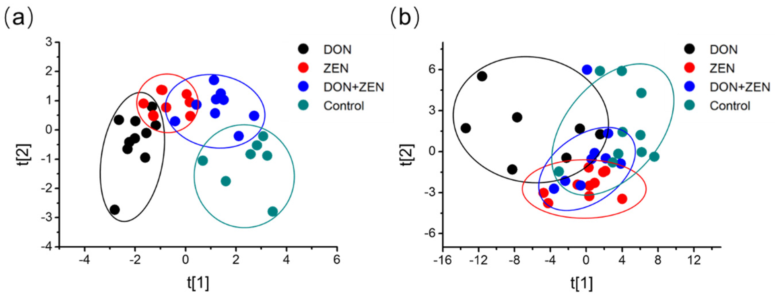 Non-supervised Principal Component Analysis (PCA). Five-week-old mice were treated with 2 mg/kg DON, 20 mg/kg ZEN, or combined DON and ZEN, with final concentration 2 mg/kg DON, 20 mg/kg ZEN, for 21 days. PCA representation of major sources of metabolites variability through a non-targeted analysis by GC-MS to monitor metabolic changes during the (a) serum (R2X = 0.37, Q2 = 0.23) and (b) liver invasion (R2X = 0.38, Q2 = 0.20). Data points represent four technical replicates from two independent experiments (biological replicates; n = 7–10) injected randomly into the GC-MS. The signals corresponding to different treatments were compared after treatment of log transformation and Pareto scaling.
