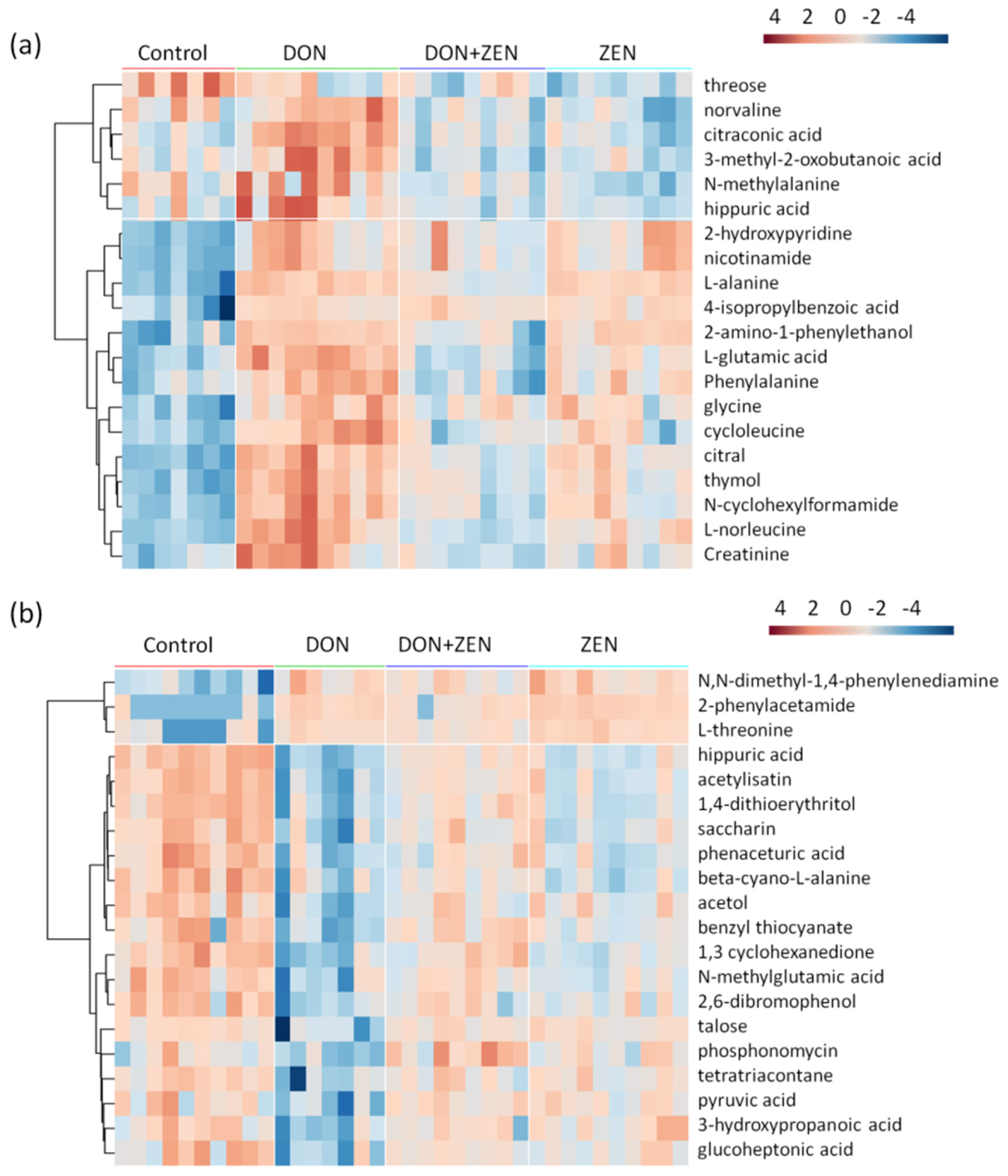 Heat maps, generated by hierarchical Pearson clustering, of the first 20 metabolites, significant from ANOVA, in the serum-metabolome (a) and liver-metabolome (b). The data set was screened using t-test p value < 0.05, variable importance for the projection (VIP) value > 1, similarity value > 700. Five-week-old mice were treated with 2 mg/kg DON, 20 mg/kg ZEN, or combined DON and ZEN, with final concentration 2 mg/kg DON, 20 mg/kg ZEN, for 21 days. Data points represent four technical replicates from two independent experiments (biological replicates; n = 7–10) injected randomly into the GC-MS. The signals corresponding to different treatments were compared after treatment of Log transformation and Pareto scaling, and the samples in the score plots of serum and liver tissue metabolomes were within the 95% Hotelling T2 ellipse.