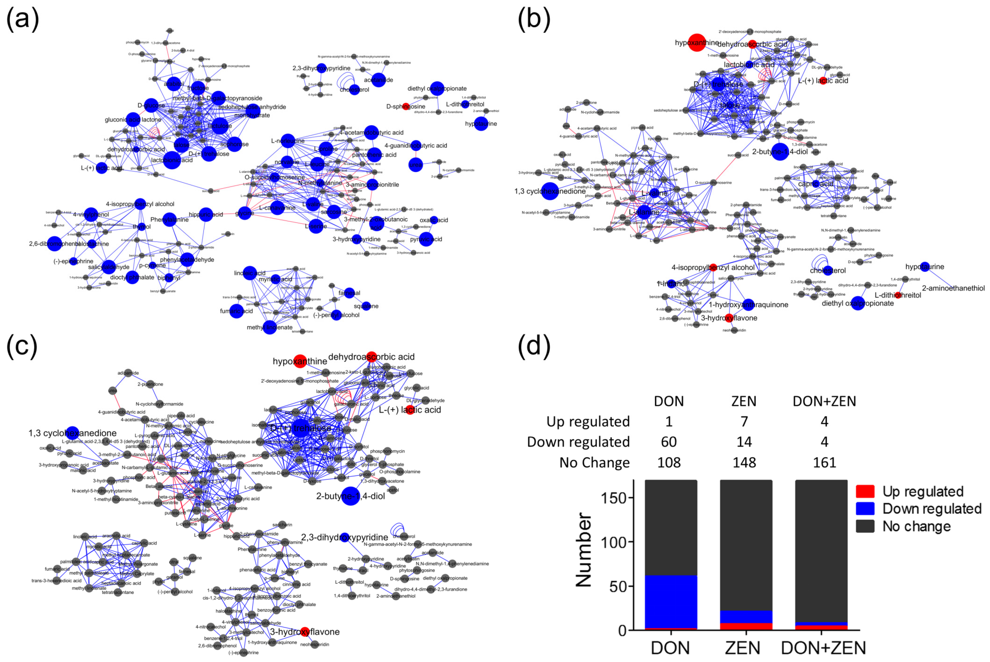 The pathway mapping of metabolites detected in liver of mice treated with (a) 2 mg/kg DON; (b) 20 mg/kg ZEN; and (c) DON + ZEN with final concentration of 2 mg/kg DON and 20 mg/kg ZEN, for 21 days. The metabolic pathways were generated through MetaMapp, and drew by CytoScape. The red balls represent increasing metabolites compared with control group, blue balls represent decreasing, and grey balls represent the metabolites with insignificant change, based on the fold change direction calculated by MetaMapp. The red line for the relationship between the two metabolites, which had been included in KEGG, and the blue line for the relationship between of two metabolites, which were not included in KEGG, but the connected metabolites had a similar functional group or similar chemical structure, judged by PubChem. The diameter of the ball was related to the fold change value and t-test p value calculated by MetaBox. (d) The change trend statistics analysis of the metabolites in the three treatment groups, DON/control group, ZEN/control group, and “DON + ZEN”/control group.