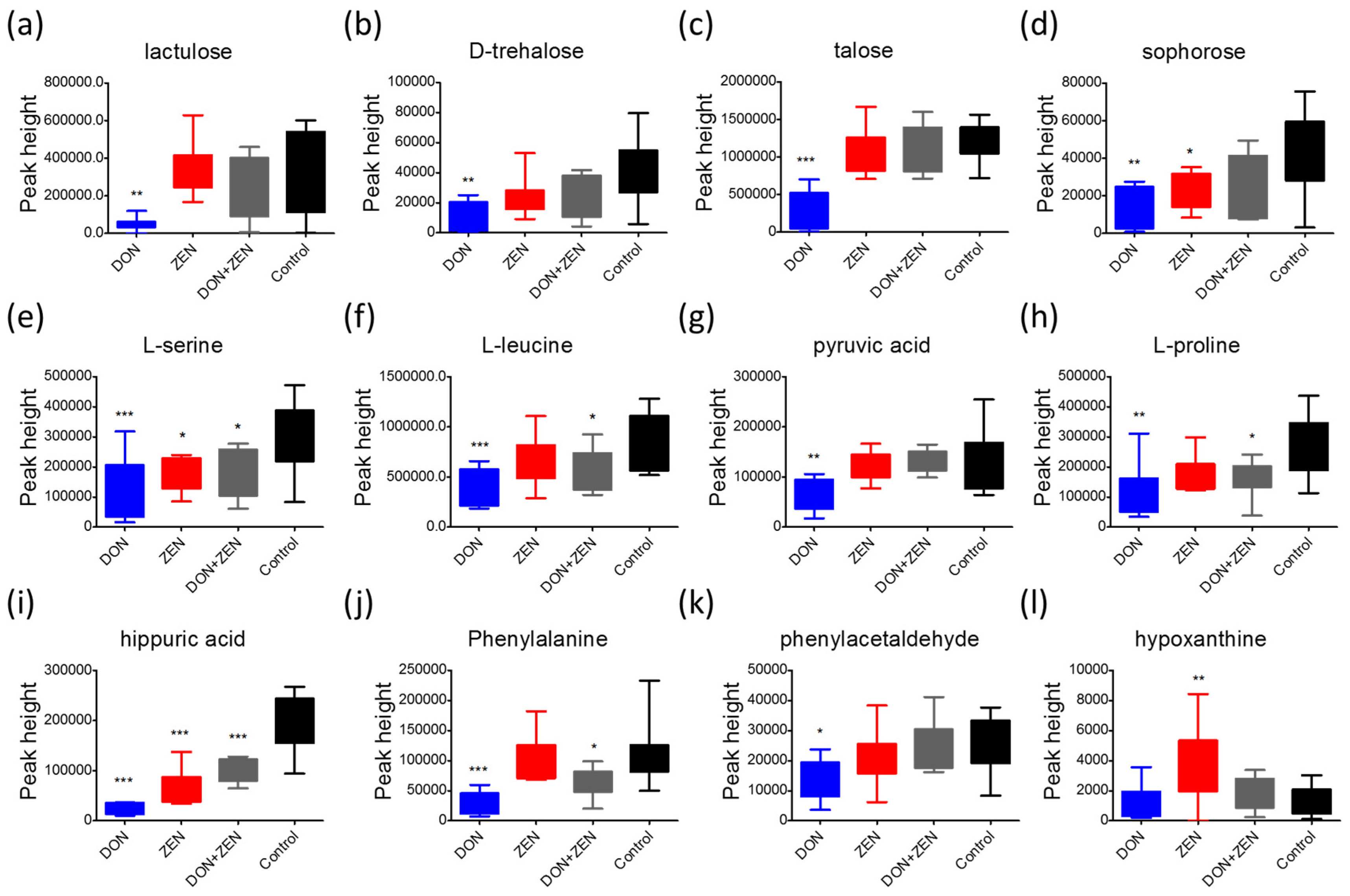 The peak height comparison of representative metabolites in four treatment groups, DON group (blue), ZEN group (red), DON + ZEN group (grey) and control group (black), whose VIP value > 1, p < 0.05, and similarity value > 700 were mapped with Fiehn library identified by MS DIAL software. The Dunett’s multiple comparison test was implemented for statistical analysis of the significance between the treatment groups (DON group, ZEN group, and DON + ZEN group) and the control group. * for p < 0.05, ** for p < 0.01%, and *** for p value < 0.001. (a) lactulose, (b) D-trehalose, (c) talose, (d) sophorose, (e) L-serine, (f) L-leucine, (g) pyruvic acid, (h) L-proline, (i) hippuric acid, (j) phenylalanine, (k) phenylacetaldehyde, (l) hypoxanthine.