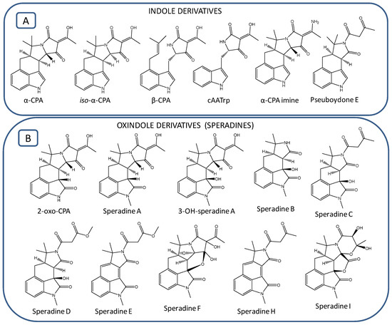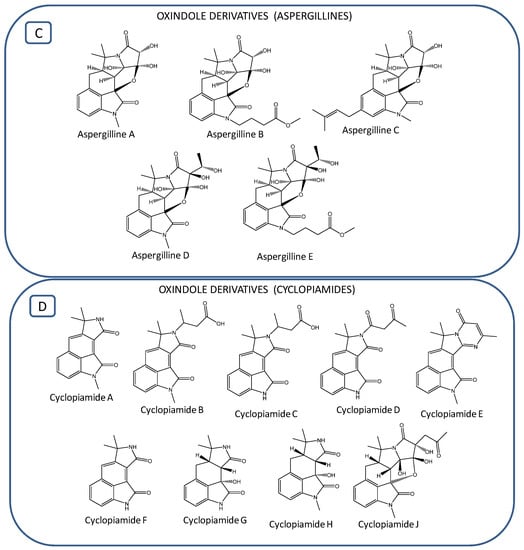 Structures of cyclopiazonic acid (CPA)-type alkaloids: (A) Indole derivatives; (B) Speradines; (C) Aspergillines; (D) Cyclopiamides.