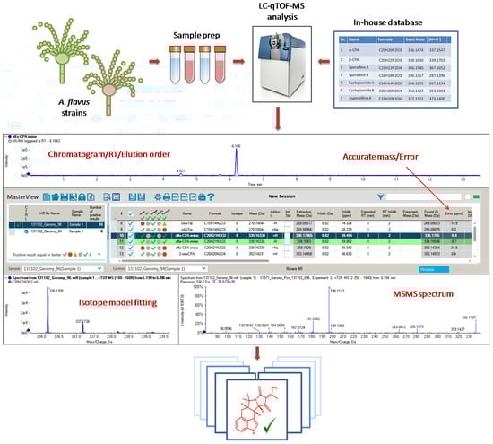 Since Aspergillus flavus is an important mycotoxigenic mold, and a very frequent food and feed contaminant with ubiquitous nature, the probability of human and animal exposure to CPA, as well as its associated health hazard, is higher compared to other fungal species. On the other hand, one method for preventing aflatoxin contamination of crops is by introducing a non-aflatoxigenic competitor strain of A. flavus to compete with natural aflatoxin-producing fungi. Although this approach may reduce aflatoxin levels in food and feed commodities, the accumulation of other mycotoxins such as CPA has been observed [43]. In this regard, it is of utmost importance to thoroughly investigate this fungus for its capability to produce known and yet unknown CPA-type alkaloids. This can be achieved through a dereplication strategy based on accurate mass high resolution mass spectrometry (HRMS) and fragmentation data [44]. Nowadays, accurate mass measurements, isotope-model fitting, tandem mass spectrometry (MS/MS) spectra and chemical databases are integrated in single software packages, thus allowing a fast and aggressive dereplication of known metabolites (Figure 2). A careful study of the fragmentation pattern of known compounds can be used to help detect and identify novel and previously unreported analogues. Hence, the main aim of this work was to investigate the diversity of the CPA family of alkaloids in different strains of A. flavus by accurate mass HRMS, thereby building knowledge towards a better assessment of the global A. flavus mycotoxin burden.