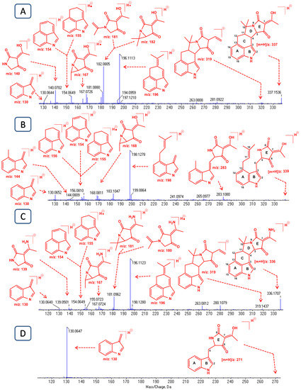 α-CPA imine is a very similar chemical entity to α-CPA, in which the hydroxyl functionality is substituted with an amino group. The fact that these metabolites are closely related to each other is also demonstrated by their shared fragmentation behavior. The MS/MS spectrum of α-CPA imine ([m + H]+/z 336.1707; ∆ < 0.1 ppm) showed ions with m/z 319, 196, 154, 155 and 130 identical with those observed for α-CPA (Figure 3C). The fragment ions containing the amino group in their structure, namely m/z 181, 180 and 139, showed 1 Da difference with their corresponding fragments from the α-CPA molecule, which is consistent with the mass difference between -OH and -NH2 groups. The biosynthetic intermediate of α-CPA, cyclo-acetoacetyl-l-tryptophan (cAATrp), showed only one prominent fragment peak at m/z 130, corresponding to the indole nucleus of this metabolite (Figure 3D). Pseuboydone E was not detected in our samples.