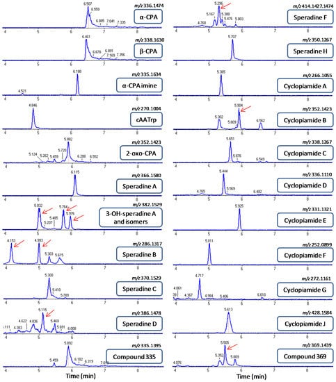 Extracted ion chromatograms (XIC) and elution order of CPA-type alkaloids detected in fungal extracts of different strains of Aspergillus flavus. The extraction mass window was set at 25 mDa. Red arrows indicate the correct retention time.