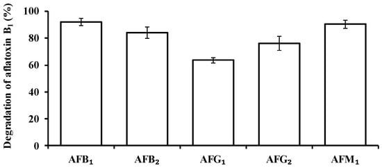 The degradation activity of isolate L7 towards AFB1, AFB2, AFG1, AFG2, and AFM1 was 92.1%, 84.1%, 63.6%, 76.1%, and 90.4%, respectively, when cultured in NB at 37 °C for 72 h (Figure 1).
