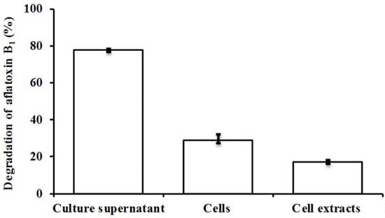 AFB1 degradation by L7 culture supernatant, viable cells, and cell extracts after 72 h of incubation. Values represent the means of three replicates and their standard errors.