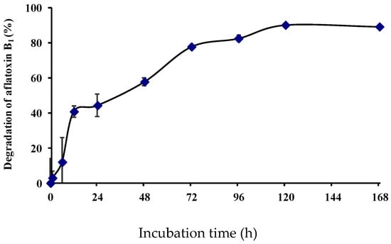 Dynamics of AFB1 degradation by isolate L7 culture supernatant at indicated time points. Values represent the means of three replicates and their standard errors.