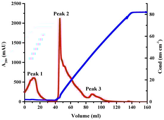 Ion-exchange chromatography using a DEAE-sepharose column. Red and blue lines represent the absorption of the protein at 280 nm and conductance value, respectively. Peak 1 corresponds to the flow-through fraction, and peaks 2 and 3 to the eluted protein.