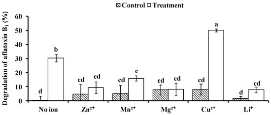 Effect of ions on AFB1 degradation by BADE from isolate L7. Values represent the means of three replicates and their standard errors. Control, AFB1 without BADE; treatment, AFB1 with BADE.