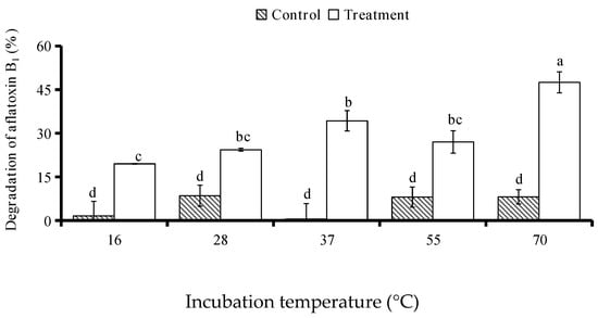 Effect of temperature on AFB1 degradation by BADE from isolate L7. The mixtures were incubated at indicated temperatures for 72 h. Values represent the means of three replicates and their standard errors. Control, AFB1 without BADE; treatment, AFB1 with BADE.