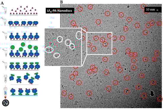 Sample preparation of 3LFN-PA-nanodiscs: (A) schematic of LFN (magenta)-PA (blue)-nanodisc (green) complex formation with stepwise addition of LFN and PA to thiol sepharose beads; and (B) a higher defocus representative field for high-contrast visualization. Individual LFN-PA-nanodisc complexes may be easily observed within this micrograph. Note the variable size of the nanodiscs in the insert.
