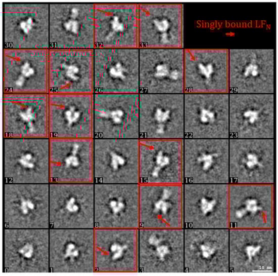 2D classification of approximately 1200 particles using SPARX confirmed singly-bound LFN with examples of clear LFN densities highlighted in red.
