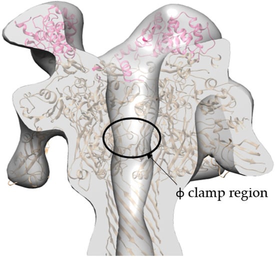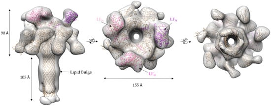 The refined 17 Å cryo-EM model of 3LFN-PA-nanodisc generated by cryoSPARC has several interesting asymmetric features (Figure 8). As mentioned previously, there are three LFN densities. A molecular dynamics flexible fitting (MDFF) of 3LFN-PA pore docked three LFN, in pink, magenta, and purple, in between subunit interfaces of PA, as was seen previously in the prepore crystal structure of 4LFN-8PA and confirmed by 15 Å cryo-EM structures using the complete LF-PA prepore structure [16,20]. Previous work has shown the N-terminal tail of LFN feeds into the pore lumen and interacts with the Phe clamp. A cross-section of the model, shown in Figure 9, reveals the narrowing of the pore lumen is consistent with the positioning of the Phe clamp region in the MDFF model. Curiously, this pH 7.5 low-resolution triply-bound LFN-PA pore structure shows an open pore region, in contrast to the closed densities observed for the previous lower-resolution, seven-fold symmetrized structures [22].