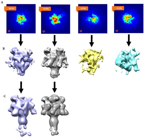 The 650 raw micrographs obtained at Baylor were evaluated using EMAN2.1 [44]. At the early evaluation stage, around 250 of these micrographs were rejected due to either gross contamination or charging artifacts visible in the Fourier transforms. A total of 30,696 particles were manually boxed out using the e2boxer.py routine of EMAN2.1 with a box size of 224 × 224 pixels. The data evaluated with EMAN2.1 and RELION, showed a heterogeneous population of single, double, and triple LFN-bound PA. Due to this heterogeneity, it was difficult to use earlier versions of RELION with this smaller dataset to produce a model without imposing C7 symmetry. The approximately 30,000 particles were reevaluated using cryoSPARC (version 0.5). First, 2D class averaging was performed (Figure 5A). Bad classes were visually identified and discarded (e.g., unrecognizable densities, smaller than predicted density envelopes, etc.). Using the remaining 18,806 good particles, an ab initio reconstruction using the cryoSPARC SGD was carried out to computationally purify the dataset into subsets containing one, two, or three bound LFN. This computation was performed with the following settings: four groups, a group similarity factor of 0.2, and 10-fold the default iterations.
