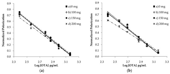 The evaluation of the matrix effect on the FPIA was performed by using spiked extracts of rye and rye crispbread at different OTA levels, in the range 2.5–75 ng/mL, and analysing different amounts of matrix equivalent of 1, 2.5 and 5 mg. The effect due to the matrix was observed when analysing 5 mg of matrix equivalent for both matrices tested. Under these conditions, the sensitivity of the immunoassay was very low, with a limit of quantification (LOQ) of 100 μg/kg. In order to increase the assay sensitivity, and to avoid matrix interferences, a rapid SPE cleanup of the extracts was optimized by using an aminopropyl silica sorbent recently used as solid-phase material in the purification of wheat for OTA determination by FPIA [43]. In particular, filtered extracts of the rye and the rye crispbread samples were purified through a SPE Bond Elut NH2 column. After the SPE cleanup, without a conditioning or washing step, OTA was eluted with a mixture of methanol/water/acetic acid 50:50:1 (v/v/v). The elution was performed in 1.75 mL for rye and 1.50 mL for rye crispbread samples; 1 mL was collected after discharging the first aliquots (0.75 mL and 0.50 mL, respectively). To estimate the matrix effect on the FP measurements after SPE cleanup, the regression line obtained with OTA standard solutions in the range 0.25–1.5 ng/mL was compared with regression lines performed by adding spiked purified extracts of rye and rye crispbread uncontaminated samples, as illustrated in Figure 1. In particular, spiked purified extracts of rye and rye crispbread were analysed by using 100, 150 and 200 mg of matrix equivalent. The parallelism and position statistical tests showed no significant differences between slopes (tcalc < 2.306; p-value > 0.05) and positions (tcalc < 2.262; p-value > 0.05) of the regression lines obtained with OTA standard solutions in buffer and those obtained with spiked purified extracts of rye and rye crispbread using 150 mg of matrix equivalent. These results showed that the rapid SPE cleanup procedure significantly decreases the matrix effect on the FPIA.