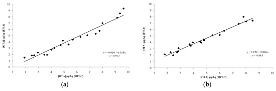 Overall average recoveries for FPIA were 86 and 95% for rye and for rye crispbread, respectively, with relative standard deviations ranging from 2 to 6%. While average recoveries obtained for the HPLC reference method were 99 and 94% for rye and for rye crispbread, respectively, with relative standard deviations ≤ 6%. The values of accuracy and precision obtained for the optimized FPIA fulfil the criteria of acceptability of an analytical method for OTA determination fixed by the European Commission [49]. In addition, a comparative analysis of a total of 30 rye and rye crispbread samples, of which 20 were spiked samples with OTA contaminations in the range 2–9.5 μg/kg and were 10 blank samples (uncontaminated samples), was carried out by both FPIA and HPLC method. Good correlations were found for the tested matrices between OTA concentrations obtained by FPIA and those obtained by the HPLC reference method, with coefficients of correlation (r) of 0.977 and 0.985 in rye and in rye crispbread, respectively (Figure 2). The linear regression fits were [OTA by FPIA] = −0.950 + 0.955 [OTA by HPLC] for rye and [OTA by FPIA] = +0.222 + 0.886 [OTA by HPLC] for rye crispbread (data corrected for average recoveries). These findings confirmed the good performance of the optimized FPIA in terms of accuracy and precision. Furthermore, no false positive result was observed in the analysis of blank samples by FPIA.