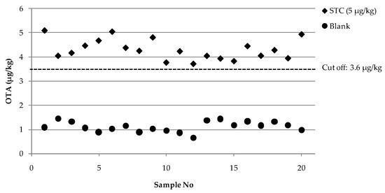 Concerning the single-laboratory validation, mean values of the test response for OTA were 4.3 and 1.1 μg/kg, with relative standard deviation under repeatability conditions (RSDr) of 10 and 13% and a relative standard deviation under within-reproducibility conditions (RSDRI), i.e., intermediate precision, of 10 and 19% for artificially contaminated samples at screening target concentration (STC) of OTA and uncontaminated samples (blank), respectively. Taking into account the mean value and standard deviation of STC (SDSTC), estimated by analysis of variance (nested ANOVA, p-value = 0.05), the cut-off level and the rate of suspect results were calculated as reported in the Materials and Methods section. In particular, the cut-off level result was 3.6 μg/kg and the rate of suspect results for blank samples was less than 0.1%. No significant difference was observed in the determination of OTA content over 5 different days at STC (p-value = 0.402). The overall intermediate precision data, with results equal to or less than 22%, can be considered acceptable, taking into account the typical performance profile of immunoassays when applied for screening purposes. Moreover, Figure 3 shows a graphical presentation of the results, reporting the OTA content determined in 20 artificially contaminated rye samples at STC and in 20 blank rye samples, analysed over 5 different days with the calculated cut-off level. The plot highlights the ability of the method to discriminate between blank and artificially contaminated samples at STC providing two well defined groups of results. This aspect was also mirrored by the negligible rate of suspect results (i.e., less than 0.1%). These results indicate FPIA performances suitable for small scale collaborative trials.