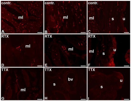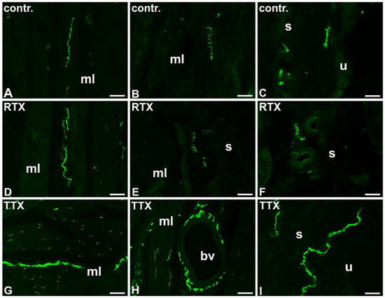 The distribution and relative frequency of VAChT-IR nerve terminals in the control (contr.; A–C), RTX-treated (RTX; D–F), or TTX-treated (TTX; G–I) pigs; muscle layer (mL), blood vessel (bv), submucosa (s), urothelium (u); 20×.