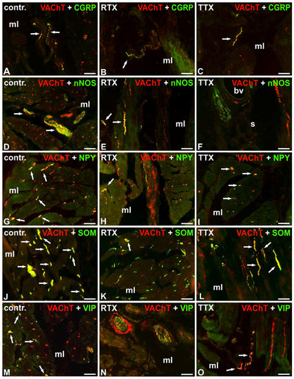 Furthermore, the present study has revealed that both RTX and TTX induce changes in the chemical phenotype of the investigated cholinergic nerve terminals, as the treatment with either of the toxins was followed by a decrease in the number of VAChT-IR NF that were immunopositive to CGRP, nNOS, SOM, or VIP. Additionally, RTX intravesical instillation, in contrast to TTX instillation, resulted in a decrease in the number of VAChT-IR/NPY-IR NF. The reason for the decreased expression of some of the investigated neurotransmitters or their markers in the cholinergic axons after the toxins instillation is not clear, as their functions when co-expressed with ACh are still not fully understood in the urinary tract. However, it may be expected that all these substances somehow influence the contractility of the bladder’s smooth musculature.