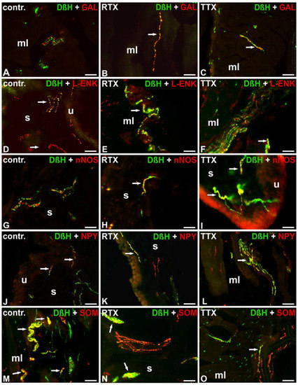 Double-labeling investigations revealed some distinct changes in the chemical coding of the noradrenergic NF after RTX treatment. In the muscle layer, in contrast to the findings obtained from the control group, single DβH-IR NF revealed immunoreactivity to GAL. In the muscle layer and around the blood vessels, the number of DβH-IR nerve terminals containing immunoreactivity to L-ENK or SOM was also higher. The number of DβH/NPY-IR axons was definitely lower in all the investigated areas of the urinary bladder wall. Additionally, again, in contrast to the findings obtained from the control group, a moderate number of DβH-IR NF expressed immunoreactivity to nNOS in the submucosa and beneath the urothelium. DβH-positive NF were PACAP-, SP-, and VIP-immunonegative (Table 4; Figure 4C,F,I,L,O).
