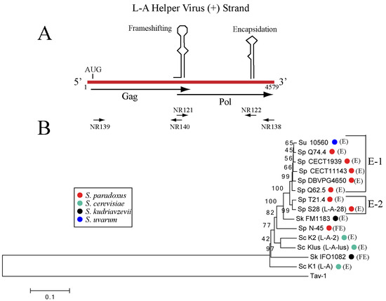 - Rodríguez-Cousiño, N.; Esteban, R. Relationships and Evolution of Double-Stranded RNA Totiviruses of Yeasts Inferred from Analysis of L-A-2 and L-BC Variants in Wine Yeast Strain Populations. Appl. Environ. Microbiol. 2017, 83, e02991-16. [Google Scholar] [CrossRef] [PubMed]