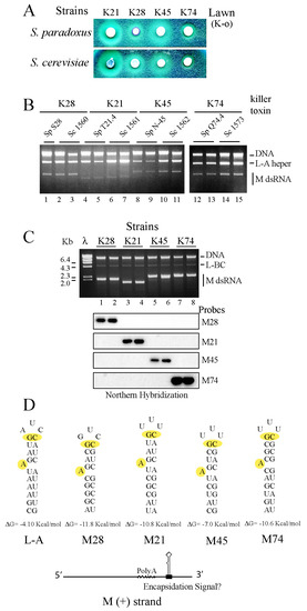 Many yeasts produce killer toxins that kill other yeast of the same or different species. Most killer toxins are encoded on double-stranded RNA (dsRNA) viruses called M, which depend for their maintenance on a helper virus (generically called L-A) that provides the viral capsids where L-A and M are separately encapsidated. Saccharomyces cerevisiae virus L-A (ScV-L-A) is the type species of the Totivirus genus in the Totiviridae family and is widely distributed in yeasts (killer or non-killer) and other fungi [1]. The replication cycle of L-A (and its satellite M1) in the yeast cytoplasm of K1 killer strains has been thoroughly investigated [2]. The L-A (+) strand (4.6 Kb) contains two overlapping open reading frames (ORFs). The structural protein of the capsid (Gag) is encoded on the first ORF, while the viral RNA polymerase (Pol) is translated as a fusion protein (Gag-Pol) of the two overlapping frames by a −1 ribosomal frame shifting [3,4]. The so-called “killer system” has been extensively studied in S. cerevisiae [5,6] where four different killer toxins have been described: K1, K2, K28 and Klus, encoded on M1, M2, M28 and Mlus dsRNAs, respectively. Their sizes vary from 1.5 to 2.4 Kb [7,8,9,10]. Killer toxins are secreted glycoproteins with no amino acid sequence conservation among them that are translated initially as precursors called “preprotoxins” (pptox). Each type of killer strain is able to kill other killer-producing strains or non-killer yeasts, but it is immune to its own toxin. With respect to the killing mechanism, K1 causes pore formation in the cytoplasmic membrane of the sensitive cells and K2 also acts on yeast cell envelope; K28 blocks DNA synthesis and the mode of action of Klus is not known [11,12,13,14,15]. The genome organization of the M dsRNA satellites is similar: the positive strand contains an ORF in the 5′-end region that codes for the pptox, followed by an internal AU-rich region (also designated as internal PolyA), and a 3′-end non-coding region where the cis signals for encapsidation and replication by the helper virus RNA polymerase are present [10,16]. A few chromosomal ORFs with homology to Klus, K1 or K2 preprotoxins have been found in S. cerevisiae or in related yeasts, suggesting that the M viruses might have originated from host messenger RNAs that were encapsidated and replicated by the L-A helper virus RNA polymerase after acquiring sequences needed for both events, probably from the genome of the L-A virus itself [17]. Several L-A variants with an average of 74% nucleotide identity exist. They are associated with different M viruses: L-A, the first described, is the one present in most laboratory strains, either K1 or sensitive strains and appears to be the M1-specific helper virus in wild K1 strains. Other variants associated to specific Ms were named after their M satellite designations, thus L-A-lus is associated with Mlus, L-A-2 to M2 and L-A-28 to M28 [17,18,19]. The association of these distinct L-As with different M viruses suggests co-evolution and we have proposed a possible role of the toxin-producing M viruses selecting the L-A variants better fit to support them [18]. Killer systems based on dsRNA helper and satellite viruses have also been described in other yeasts such as Ustilago maydis, Zygosaccharomyces bailii, Hanseniaspora uvarum and Torulaspora delbrueckii [20,21,22], and in the sensu stricto group in S. uvarum and S. paradoxus [23,24,25].