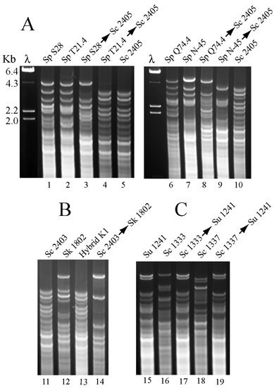 - Naumov, G.I.; Naumova, E.S.; Masneuf, I.; Aigle, M.; Kondratieva, V.I.; Dubourdieu, D. Natural polyploidization of some cultured yeast Saccharomyces sensu stricto: Auto- and allotetraploidy. Syst. Appl. Microbiol. 2000, 23, 442–449. [Google Scholar] [CrossRef]