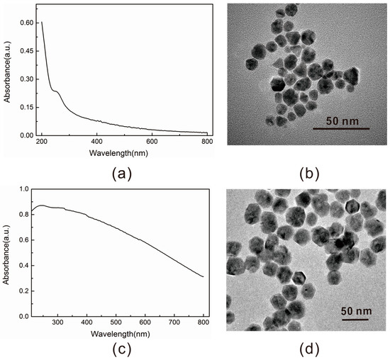 (a) Ultraviolet-visible (UV/Vis) absorption spectra of the 12 nm PdNPs; (b) transmission electron microscope (TEM) images of the 12 nm PdNPs; (c) UV/Vis absorption spectra of the 33 nm PdNPs; (d) TEM images of the 33 nm PdNPs.